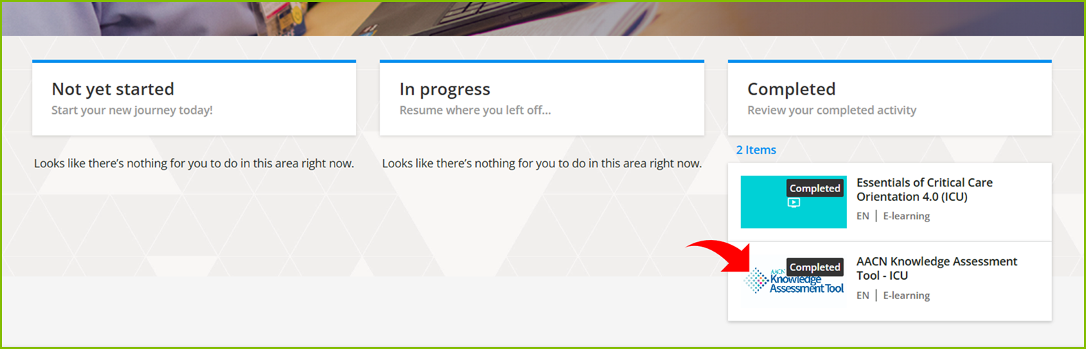 On the AACN LearnCenter, Learners are assigned “AACN Knowledge Assessment Tool-ICU” or “AACN Knowledge Assessment Tool-PCU” (as an eLearning in their transcript).